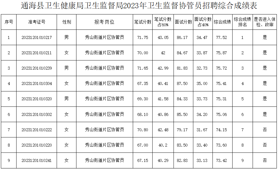 現(xiàn)將通海縣衛(wèi)生健康局衛(wèi)生監(jiān)督局2023年衛(wèi)生監(jiān)督協(xié)管員招聘綜合成績公布及體檢通知如下:
