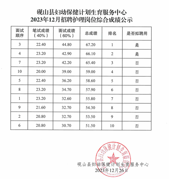 硯山縣婦幼保健院2023年12月招聘護(hù)理崗位綜合成績(jī)及擬聘用人員名單公示: