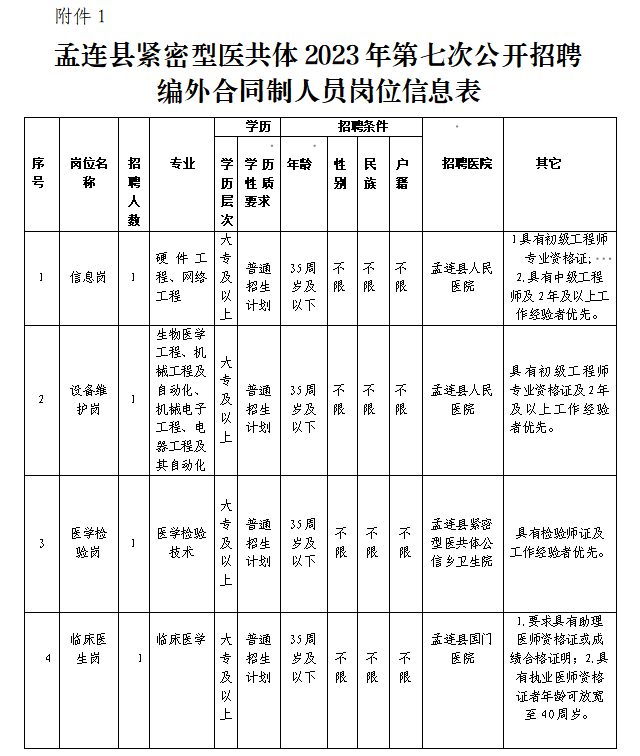 詳見《孟連縣緊密型醫(yī)共體2023年第七次公開招聘編外合同制人員崗位信息表》。