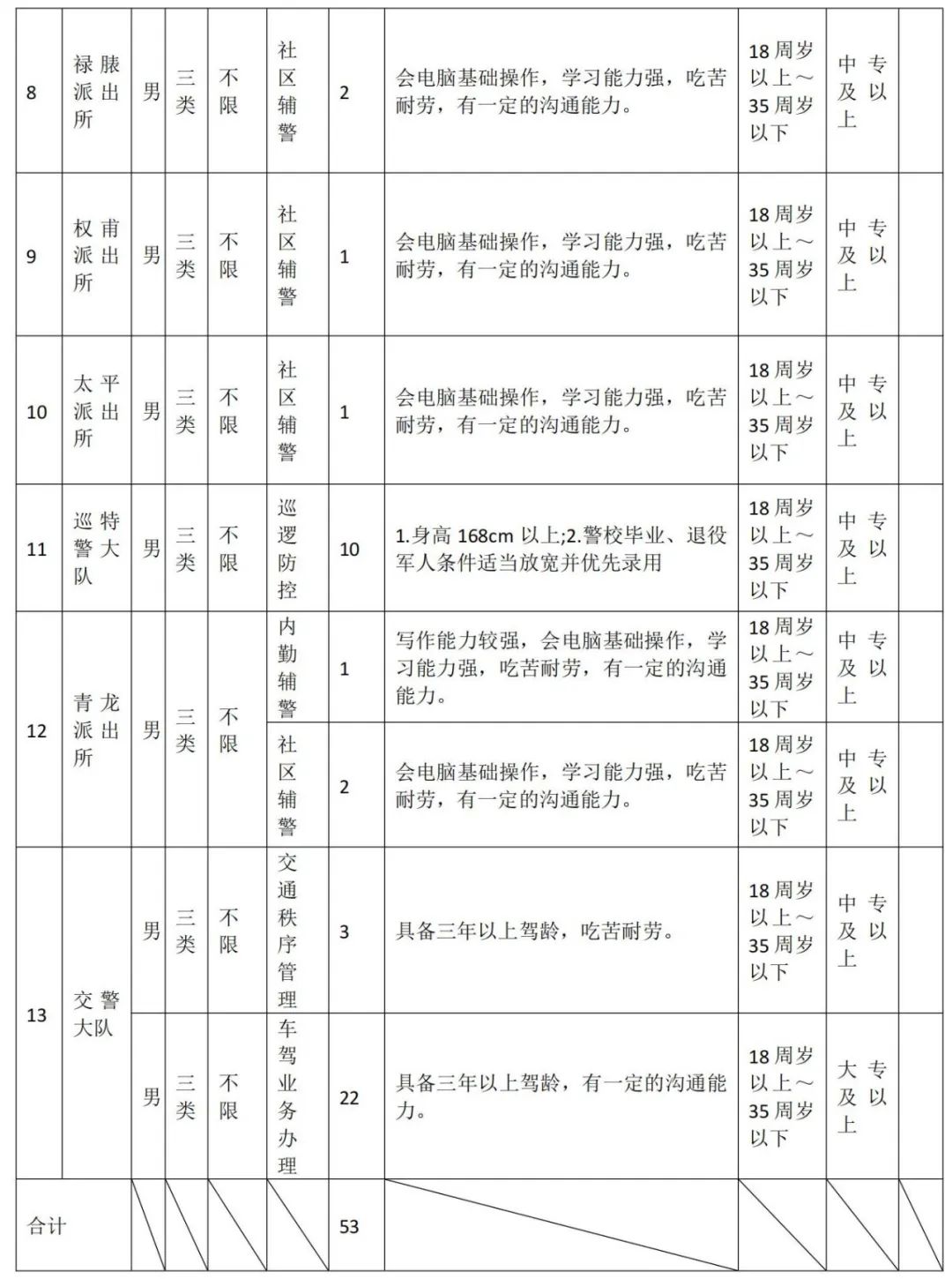 1、招錄所(隊)為連然派出所、金方派出所、郎家莊派出所、石江派出所、縣街派出所、祿脿派出所、青龍派出所、太平派出所、巡特警大隊、交警大隊。