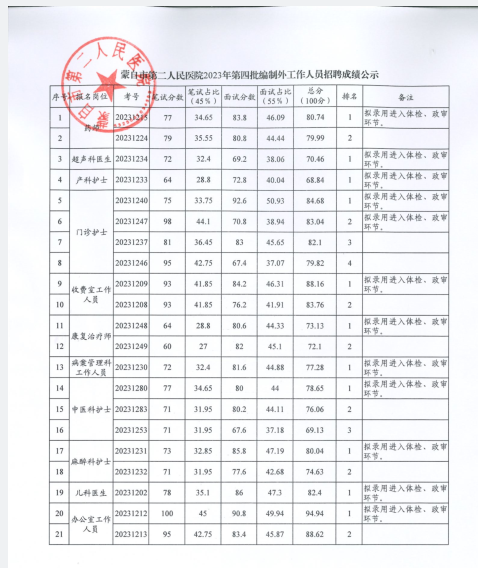 蒙自市第二人民醫(yī)院2023年第四批編制外工作人員招聘成績公示