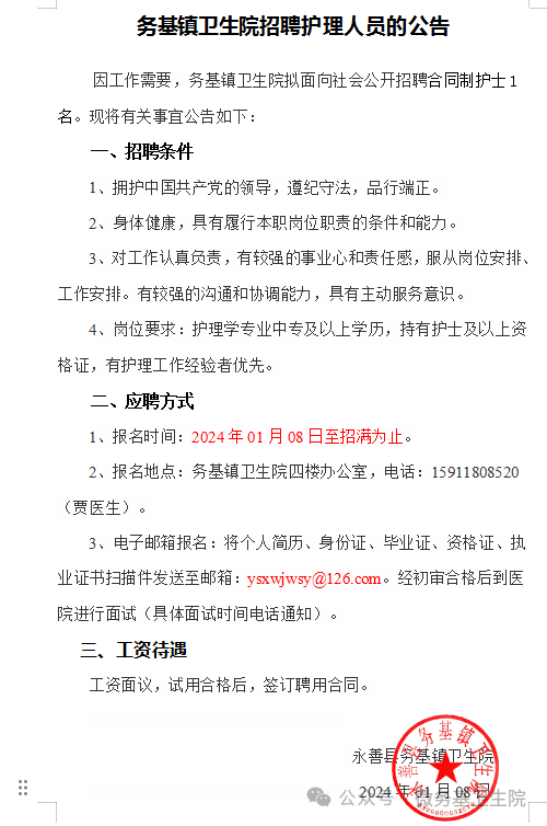 務基鎮(zhèn)衛(wèi)生院招聘護理人員的公告 來源:https://mp.weixin.qq.com/s/mWV5SKxl70Rayppq9vvTiA