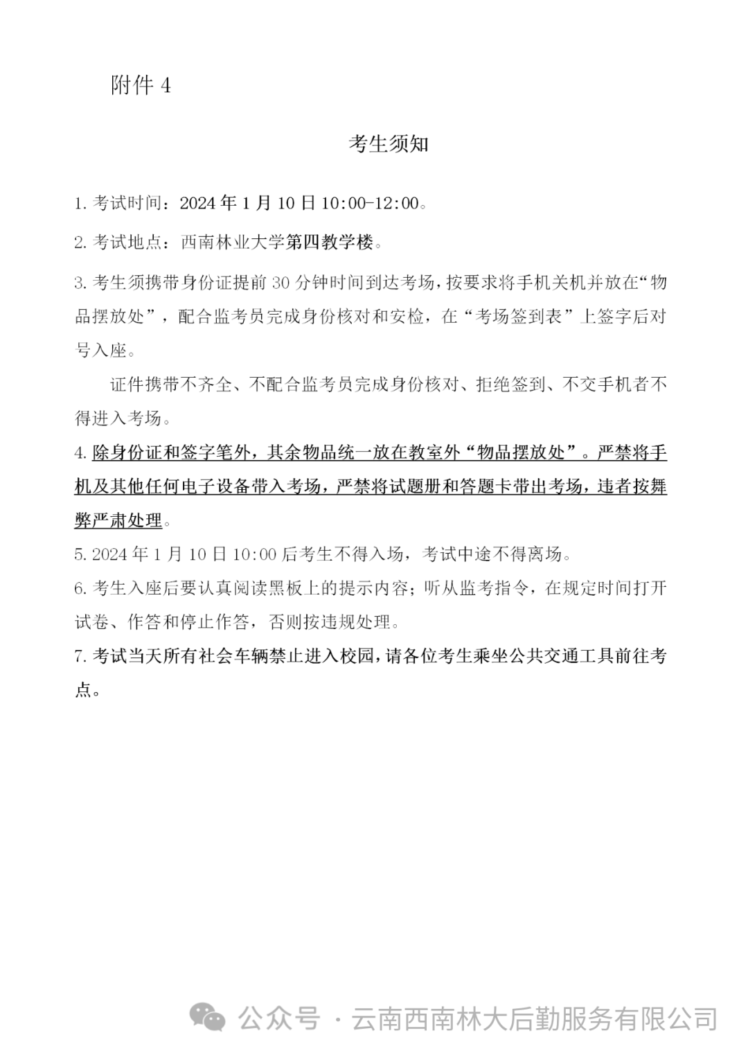 2024年1月11日前將通過“云南西南林大后勤服務(wù)有限公司”微信公眾號通知進(jìn)入面試人員名單及要求,請及時(shí)關(guān)注。