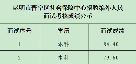 因工作需要,昆明市晉寧區(qū)社會(huì)保險(xiǎn)中心招聘編外人員1名,經(jīng)前期報(bào)名審查,2名人員進(jìn)入面試。2024年1月11日,經(jīng)昆明市晉寧區(qū)社會(huì)保險(xiǎn)中心組織面試,現(xiàn)將面試考核成績(jī)公示如下。公示期自2024年1月12日—2024年1月16日,聯(lián)系電話:0871-67896317。