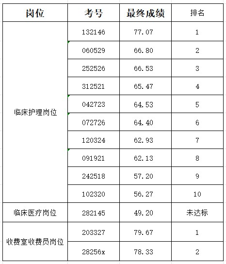 根據(jù)《丘北縣雙龍營鎮(zhèn)中心衛(wèi)生院非在編職工招聘公告》有關(guān)規(guī)定,經(jīng)筆試、面試程序,現(xiàn)將丘北縣雙龍營鎮(zhèn)中心衛(wèi)生院2024年1月公開招聘非在編崗位人員綜合成績予以公示。