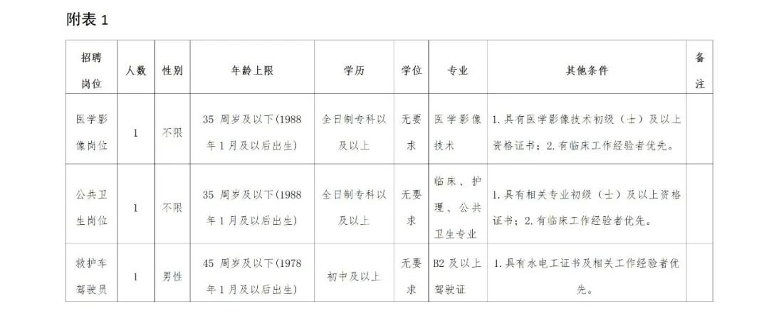 本次招聘醫(yī)學(xué)影像、公共衛(wèi)生、救護車駕駛員(含水電后勤)3個崗位,待遇按5000元/月(含社保)。