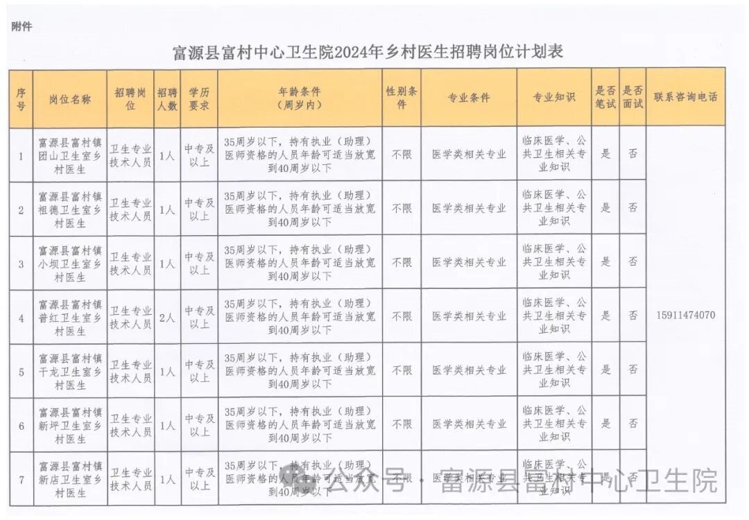 為進(jìn)一步加強(qiáng)富村鎮(zhèn)鄉(xiāng)村醫(yī)生隊伍建設(shè),合理配備鄉(xiāng)村醫(yī)生,更好滿足農(nóng)村居民日益增長的醫(yī)療衛(wèi)生需求,貫徹落實“強(qiáng)基層”的重要目標(biāo),推動富村鎮(zhèn)衛(wèi)生健康事業(yè)加快發(fā)展,富源縣富村中心衛(wèi)生院決定對富村鎮(zhèn)部分鄉(xiāng)村醫(yī)生崗位進(jìn)行公開招聘,現(xiàn)將有關(guān)事項公告如下: