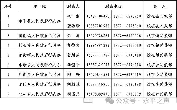 ②也可撥打縣征兵辦、各鄉(xiāng)鎮(zhèn)武裝部電話咨詢: