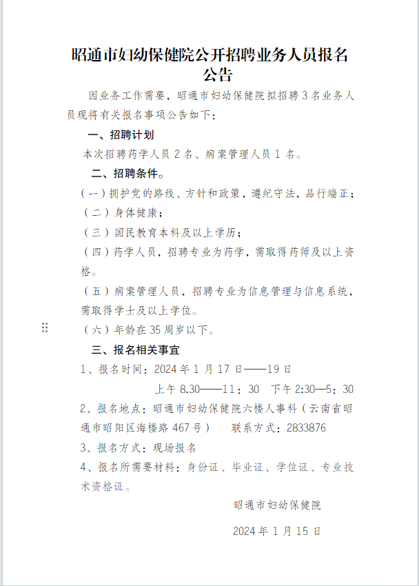 2024年昭通市婦幼保健院招聘業(yè)務(wù)人員報名公告