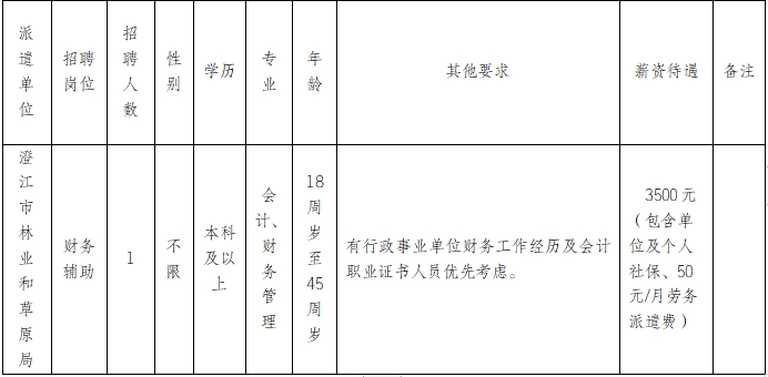 澄江市林業(yè)和草原局因工作需要,現(xiàn)委托澄江市啟澄人力資源有限責任公司,面向社會公開招聘財務輔助崗工作人員1名,現(xiàn)將有關事項公告如下: