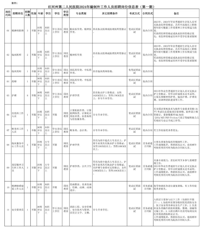 1.紅河州第二人民醫(yī)院2024年編制外工作人員招聘崗位信息表.xls