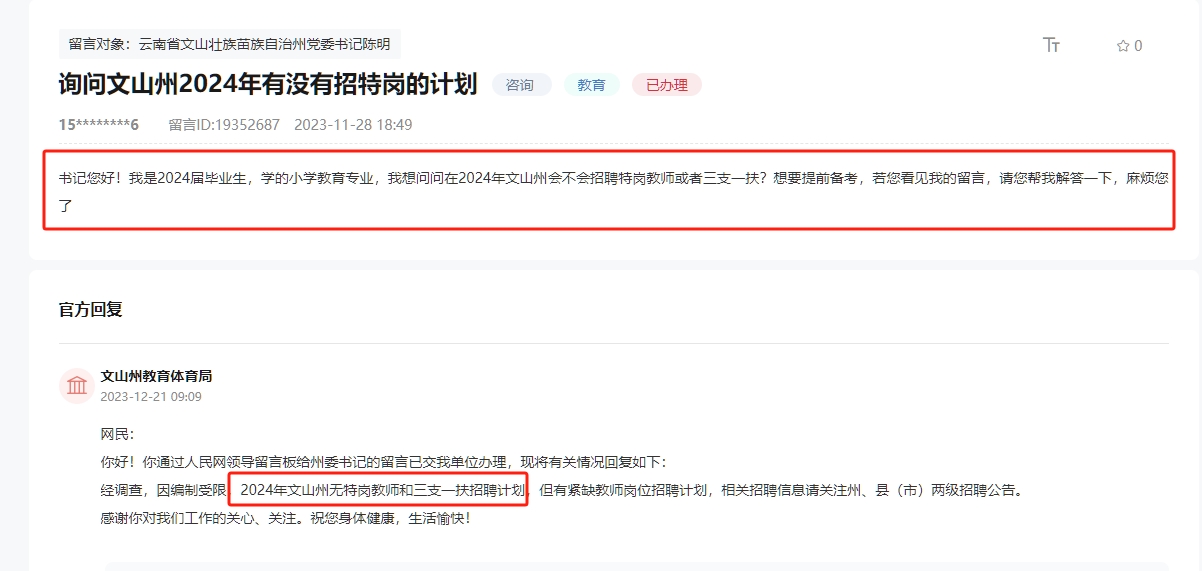 標題:書記您好!我是2024屆畢業(yè)生,學的小學教育專業(yè),我想問問在2024年文山州會不會招聘特崗教師或者三支一扶?想要提前備考,若您看見我的留言,請您幫我解答一下,麻煩您了