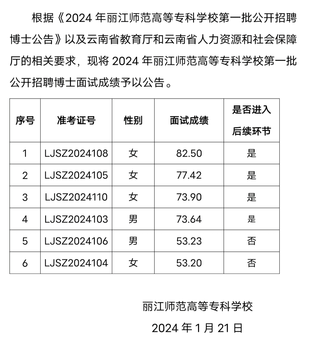 2024年麗江師范高等專科學(xué)校第一批招聘博士面試成績(jī)公告