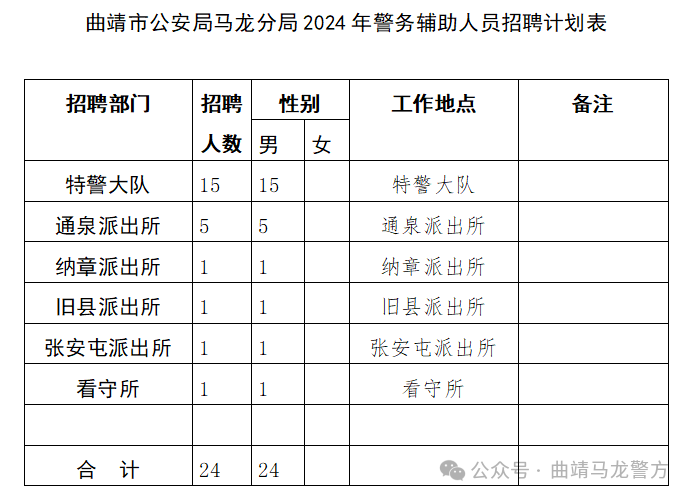 附:曲靖市公安局馬龍分局2024年警務(wù)輔助人員招聘計劃表