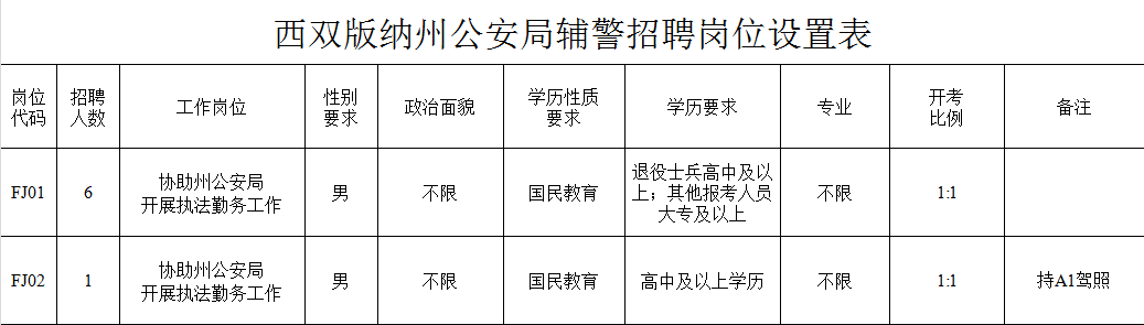 根據(jù)工作需要,西雙版納州公安局現(xiàn)面向社會(huì)公開(kāi)招聘警務(wù)輔助人員(以下簡(jiǎn)稱輔警),有關(guān)事項(xiàng)公告如下。