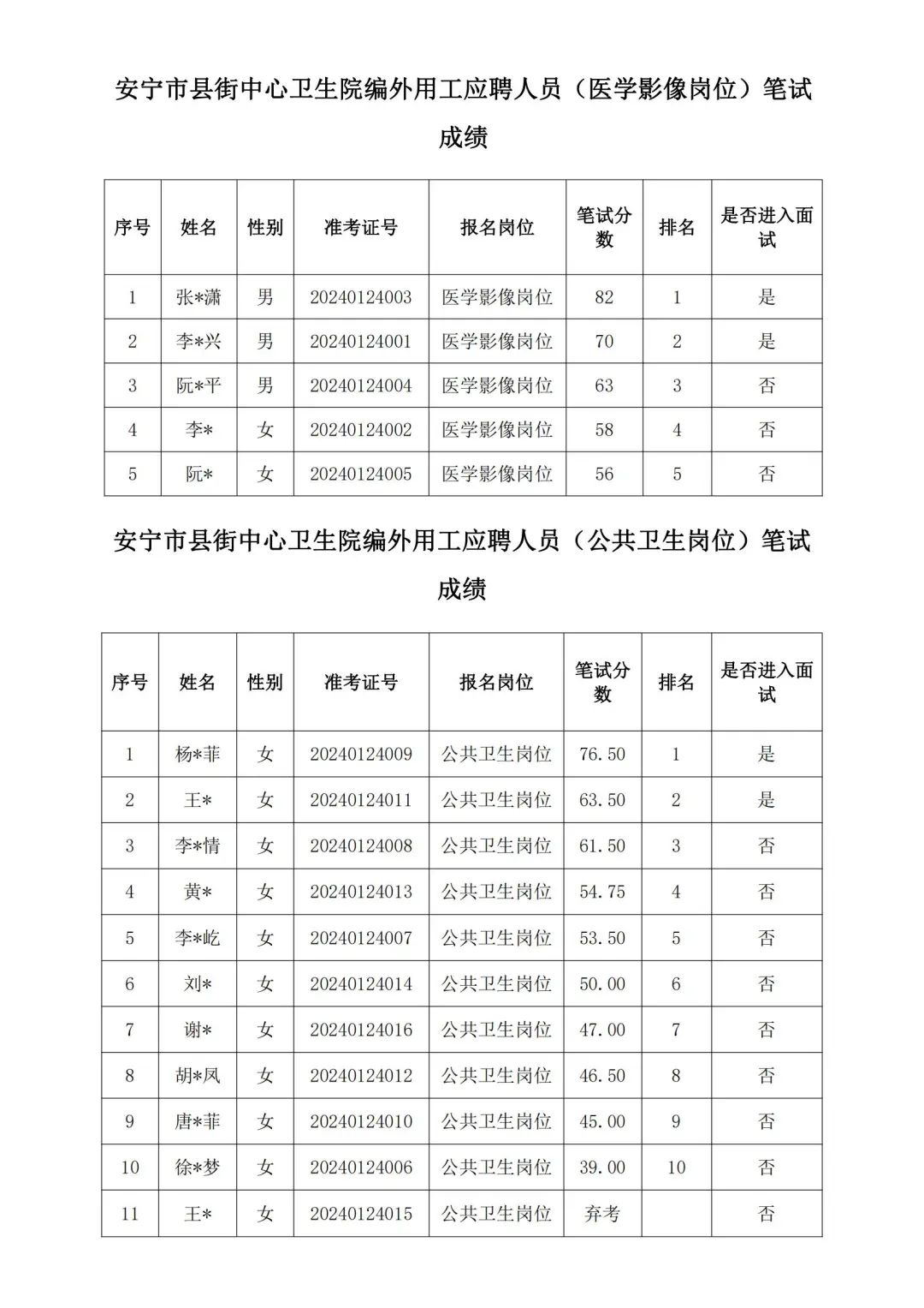 安寧市縣街中心衛(wèi)生院筆試人員成績公示