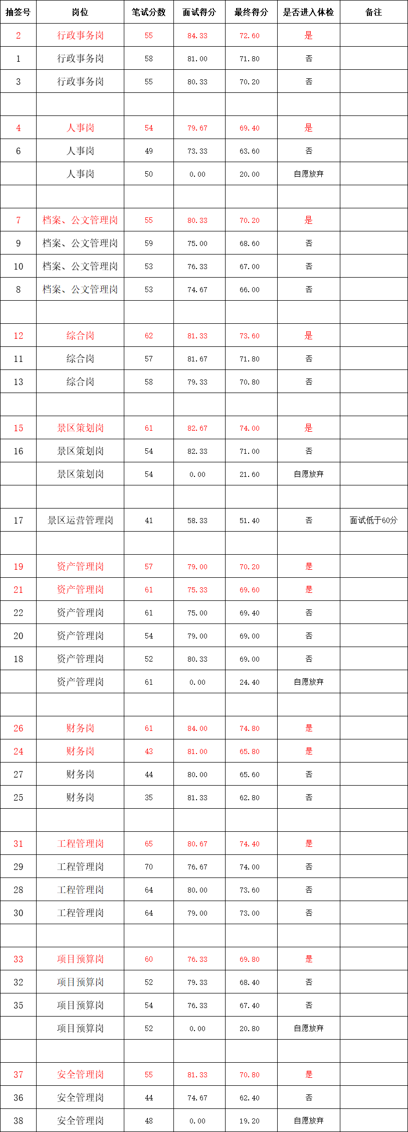 根據(jù)2023年12月22日發(fā)布的《澄江市文化旅游投資開(kāi)發(fā)有限責(zé)任公司2023年公開(kāi)招聘工作人員公告》,面試階段于2024年1月24日下午完成,根據(jù)招聘公告,綜合成績(jī)總分為100分,綜合成績(jī)=筆試成績(jī)×40%+面試成績(jī)×60%?,F(xiàn)將綜合成績(jī)及進(jìn)入體檢的人員名單公示如下: