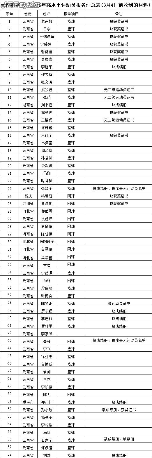 關(guān)于2015年高水平運動員專項測試時間及 報名材料統(tǒng)計情況的通知 各位考生: 1、報名材料或手續(xù)不全考生,欠缺報名材料和手續(xù)無需重新郵寄,在3月13日下午14:30到云南財經(jīng)大學體育館會議室資格審查時一并提供;請考生務(wù)必帶齊身份證、二級運動員證書、近三年比賽獲獎證書、比賽秩序冊、成績冊原件進行查驗。 2、測試時間為2015年3月14日至3月15日。3月14日早8:00在體育館門口集中點名,8:30分進行專項測試。