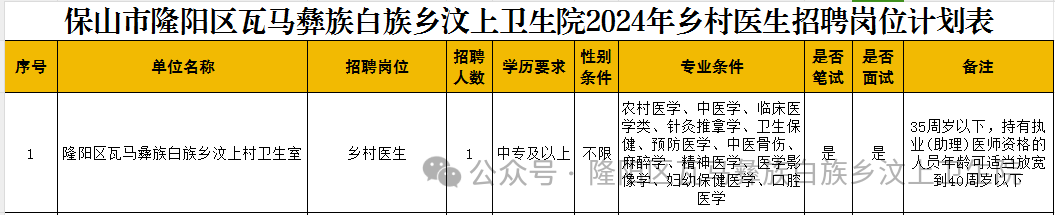 保山市隆陽(yáng)區(qū)瓦馬彝族白族鄉(xiāng)汶上衛(wèi)生院2024年鄉(xiāng)村醫(yī)生招聘公告