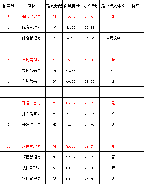 根據(jù)2023年12月12日發(fā)布的《澄江市兩山生態(tài)產(chǎn)業(yè)發(fā)展有限責(zé)任公司2023年公開(kāi)招聘工作人員公告》和2023年12月20日發(fā)布的《澄江市兩山生態(tài)產(chǎn)業(yè)發(fā)展有限責(zé)任公司2023年公開(kāi)招聘工作人員延期通知及補(bǔ)充公告公告》,面試階段于2024年1月25日完成,根據(jù)招聘公告,綜合成績(jī)總分為100分,綜合成績(jī)=筆試成績(jī)×50%+面試成績(jī)×50%。現(xiàn)將綜合成績(jī)及進(jìn)入體檢的人員名單公示如下: