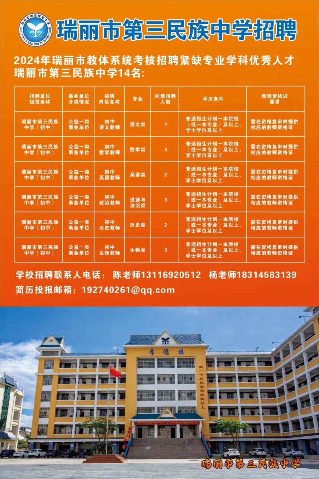 瑞麗市第三民族中學(xué)招聘