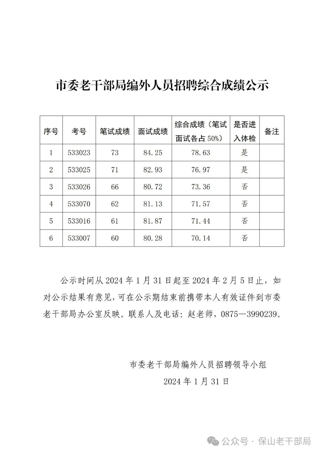 2024年保山市委老干部局編外人員招聘綜合成績(jī)公示