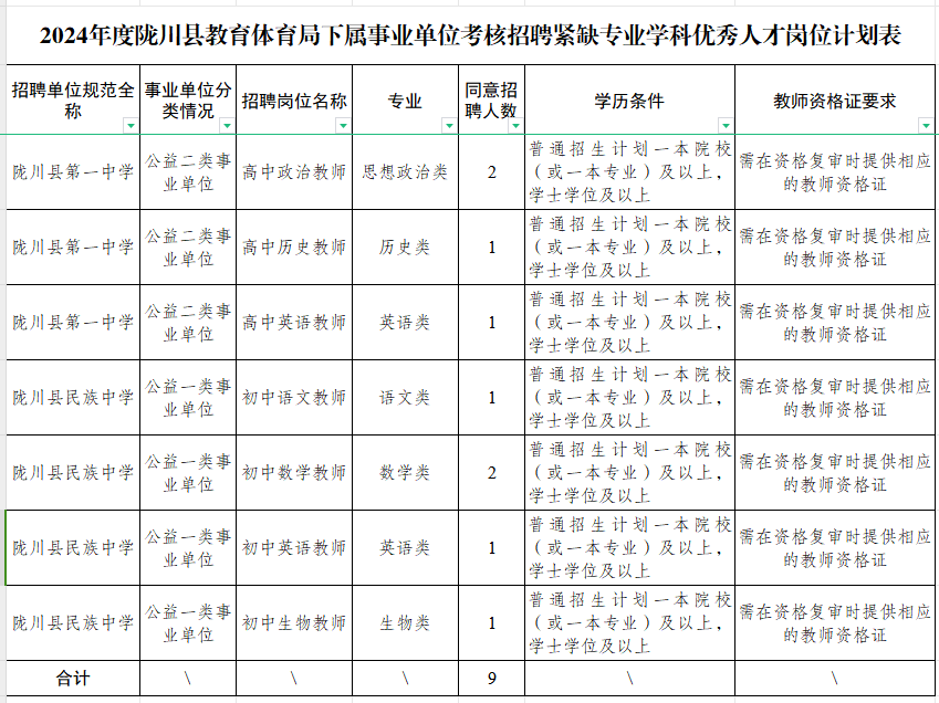 根據(jù)《關(guān)于同意縣教育體育局黨組使用編制通知單》(隴機(jī)編辦準(zhǔn)[2023]4號(hào))及《隴川縣人力資源和社會(huì)保障局關(guān)于印發(fā)2024年教育衛(wèi)生部門考核招聘緊缺專業(yè)學(xué)科優(yōu)秀人才工作方案的通知》隴人社發(fā)〔2024〕2號(hào)文件精神,2024年隴川縣教體系統(tǒng)考核招聘緊缺專業(yè)學(xué)科優(yōu)秀人才9名,其中:隴川縣第一中學(xué)4名、隴川縣民族中學(xué)5名?,F(xiàn)將有關(guān)事宜公告如下: