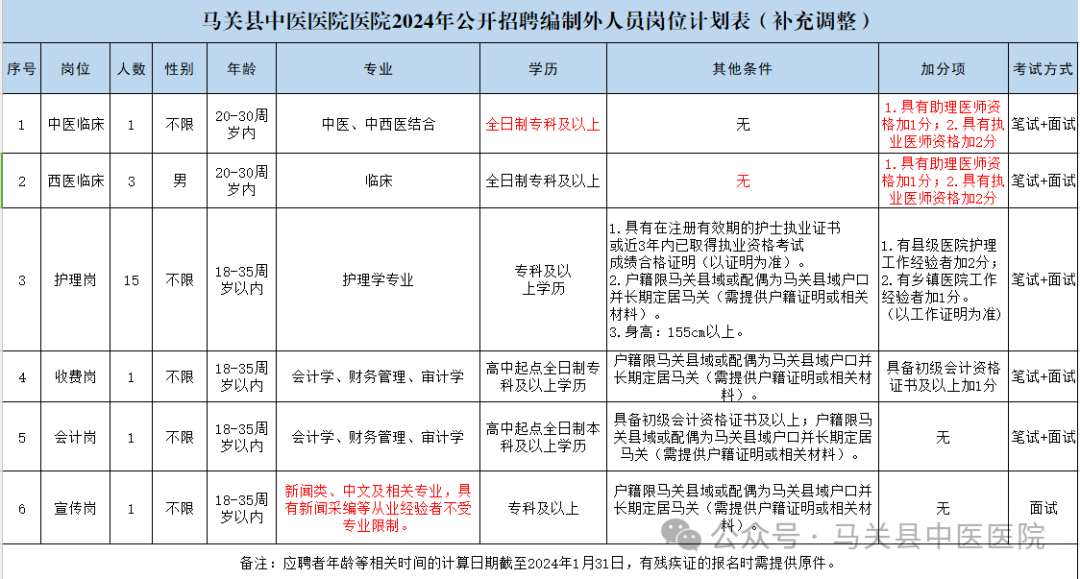 根據(jù)工作需要,經(jīng)研究決定,現(xiàn)就馬關(guān)縣中醫(yī)醫(yī)院2024年公開招聘合同制編外人員部分崗位招聘條件調(diào)整有關(guān)事項(xiàng)公告補(bǔ)充如下: