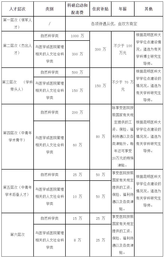 本次公開招聘的工作人員,正式聘用后納入事業(yè)單位編制內(nèi)管理,其管理和待遇按照國(guó)家和我省事業(yè)單位人事管理的相關(guān)規(guī)定執(zhí)行。醫(yī)院對(duì)引進(jìn)的高層次人才設(shè)置六個(gè)層次,引進(jìn)待遇如下: