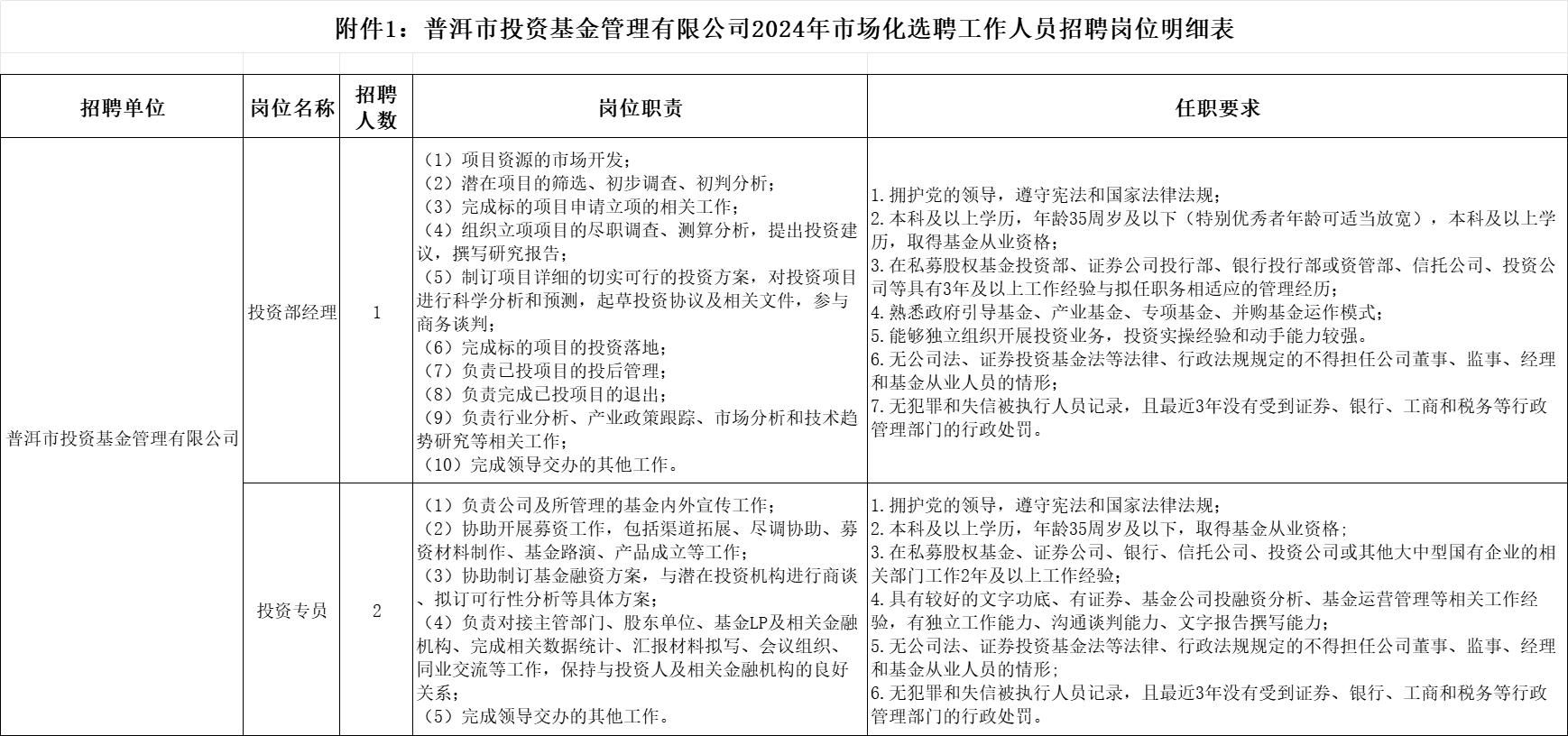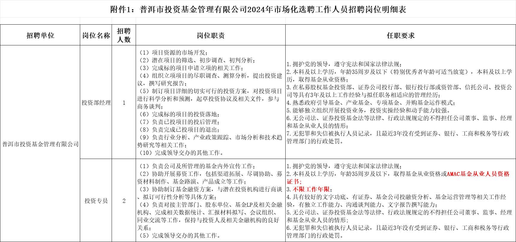 根據(jù)《普洱市投資基金管理有限公司2024年市場化選聘工作人員》的報名情況,經(jīng)研究,決定:調(diào)整投資專員招聘要求,并將招聘時間延長至2024年3月1日17:30,具體如下:
