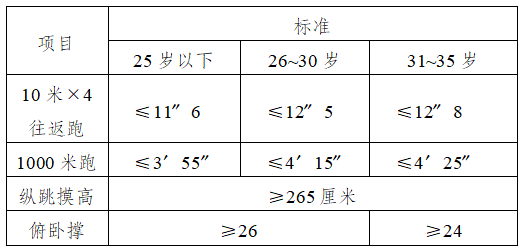體能測(cè)試由10米×4往返跑、縱跳摸高、1000米、俯臥撐四個(gè)項(xiàng)目組成,占綜合成績(jī)的70%。其標(biāo)準(zhǔn)按照人民法院司法警察基本體能評(píng)分標(biāo)準(zhǔn)執(zhí)行。體能測(cè)試標(biāo)準(zhǔn)為: