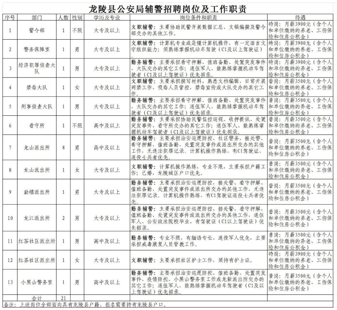 共招聘警務(wù)輔助人員21人,經(jīng)綜合考核后,確定聘用的警務(wù)輔助人員與龍陵縣公安局按規(guī)定程序訂立勞動合同,招聘崗位、條件等詳見附件。