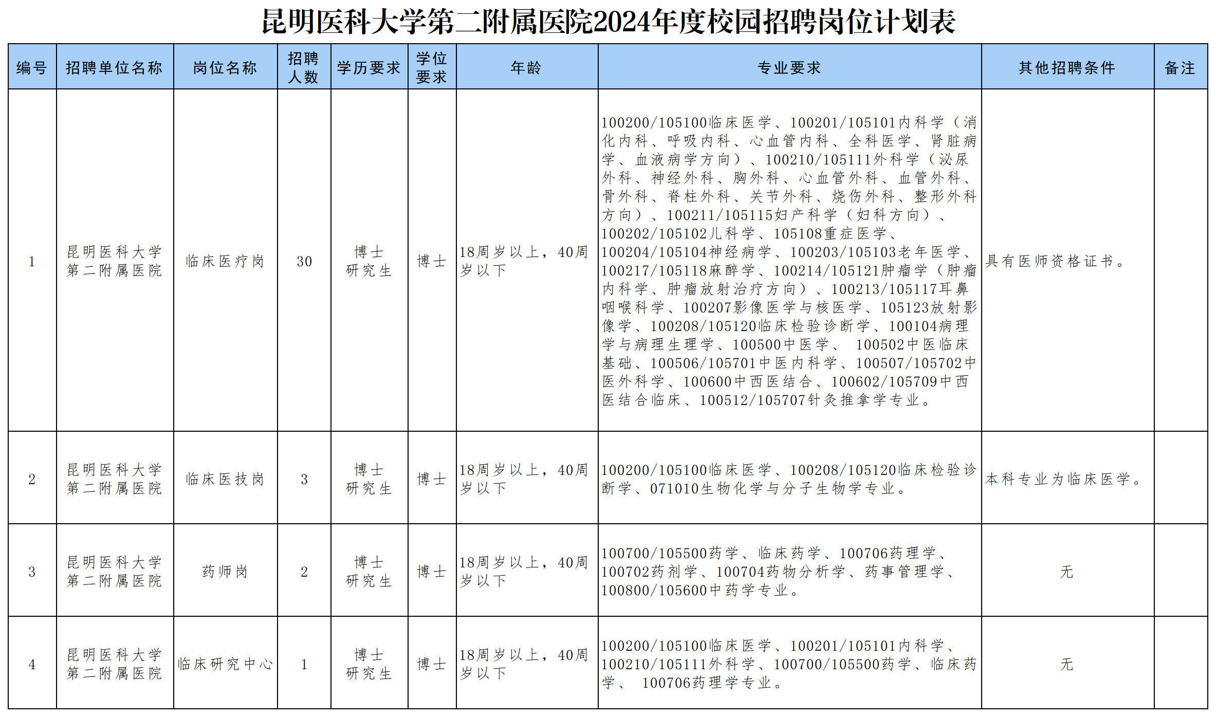 報名方式:請將個人應(yīng)聘材料原件掃描件發(fā)送至郵箱:feyrsc@126.com,郵件標(biāo)題固定格式為:2024年昆明醫(yī)科大學(xué)博士公開招聘+崗位代碼+姓名。