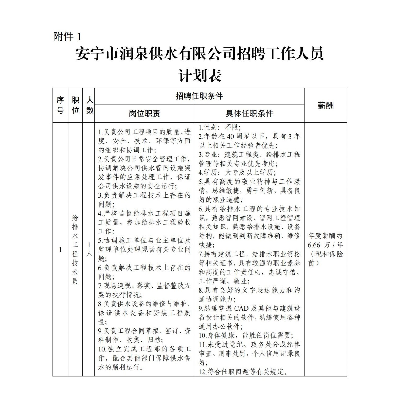 附件:1.安寧市潤泉供水有限公司招聘工作人員計劃表