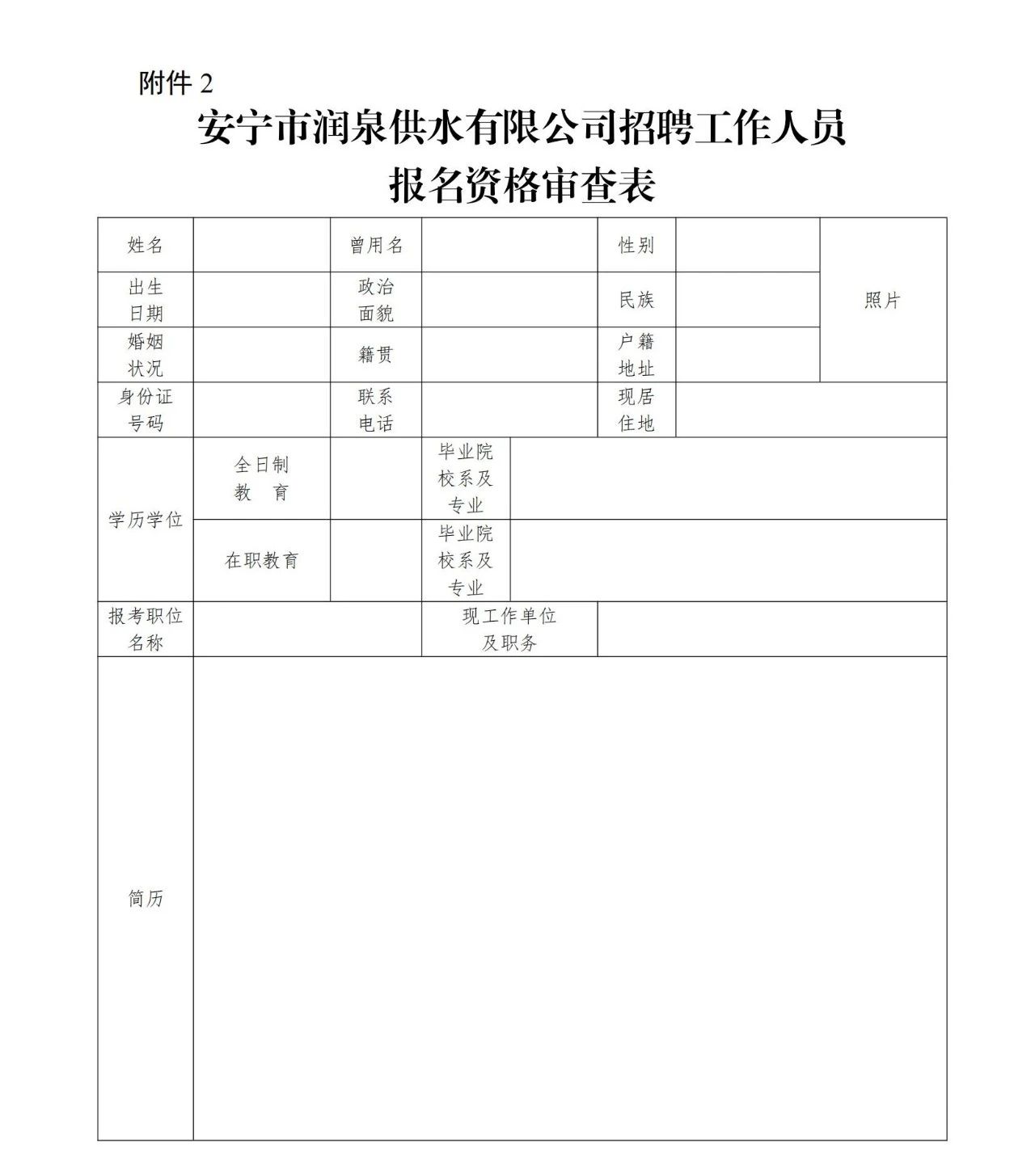 2.安寧市潤泉供水有限公司招聘工作人員報名資格審查表