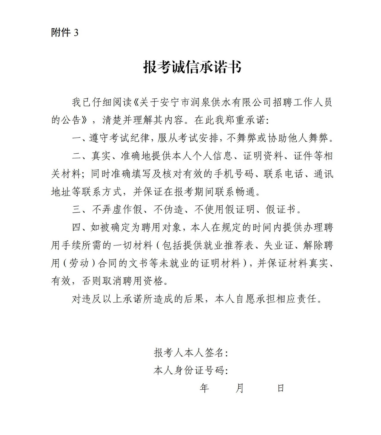 4.報名及資格審核方式:采取線下集中報名審查的方式進(jìn)行,每人只限報考一個崗位。報名人員須填寫《安寧市潤泉供水有限公司招聘人員報名資格審查表》(以下簡稱“報名資格審查表”,詳見附件2)、報考誠信承諾書(詳見附件3),并仔細(xì)核對填報信息,報名信息一經(jīng)審查通過,不允許作任何修改,因信息不實造成后續(xù)環(huán)節(jié)出現(xiàn)問題的,后果由報名者自行承擔(dān)。