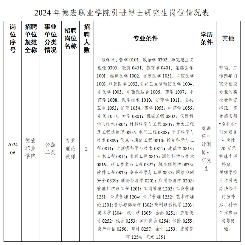 德宏職業(yè)學(xué)院共公開引進博士研究生2名,具體招聘崗位計劃詳見《2024年德宏職業(yè)學(xué)院引進博士研究生崗位情況表》。