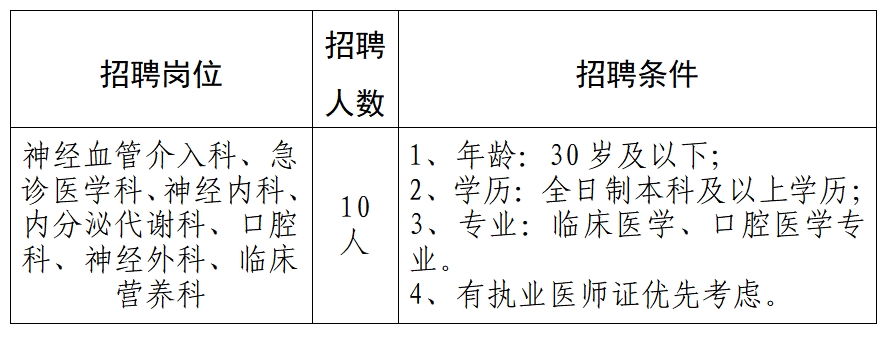 根據(jù)醫(yī)院業(yè)務(wù)發(fā)展需求,現(xiàn)需招聘編外醫(yī)生10人,具體招聘條件如下: