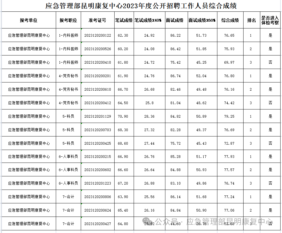 應(yīng)急管理部昆明康復(fù)中心2023年公開招聘工作人員綜合成績及體檢事宜的公告