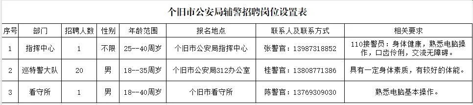根據(jù)工作需要,個舊市公安局面向社會公開招聘輔警,現(xiàn)將有關(guān)事項公告如下: