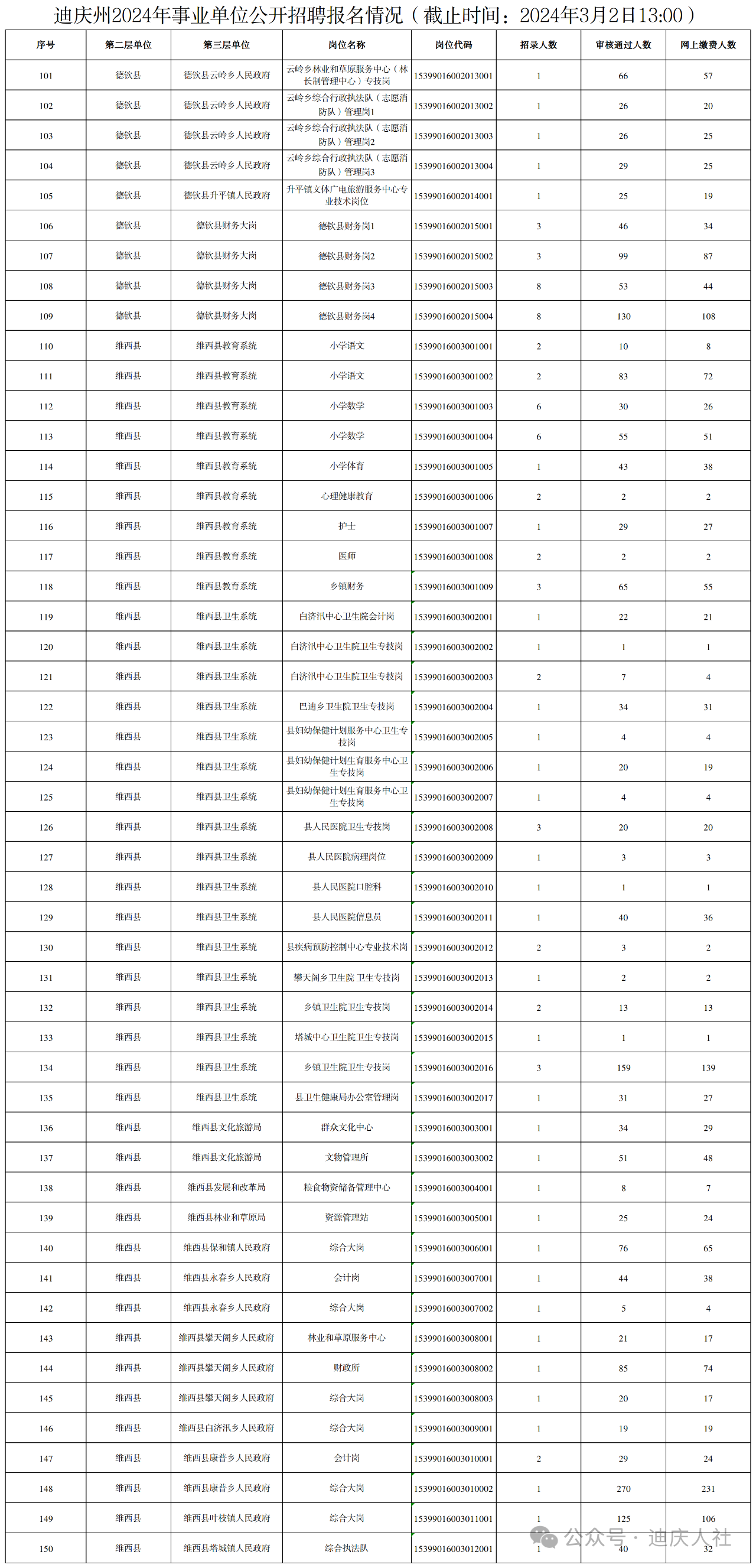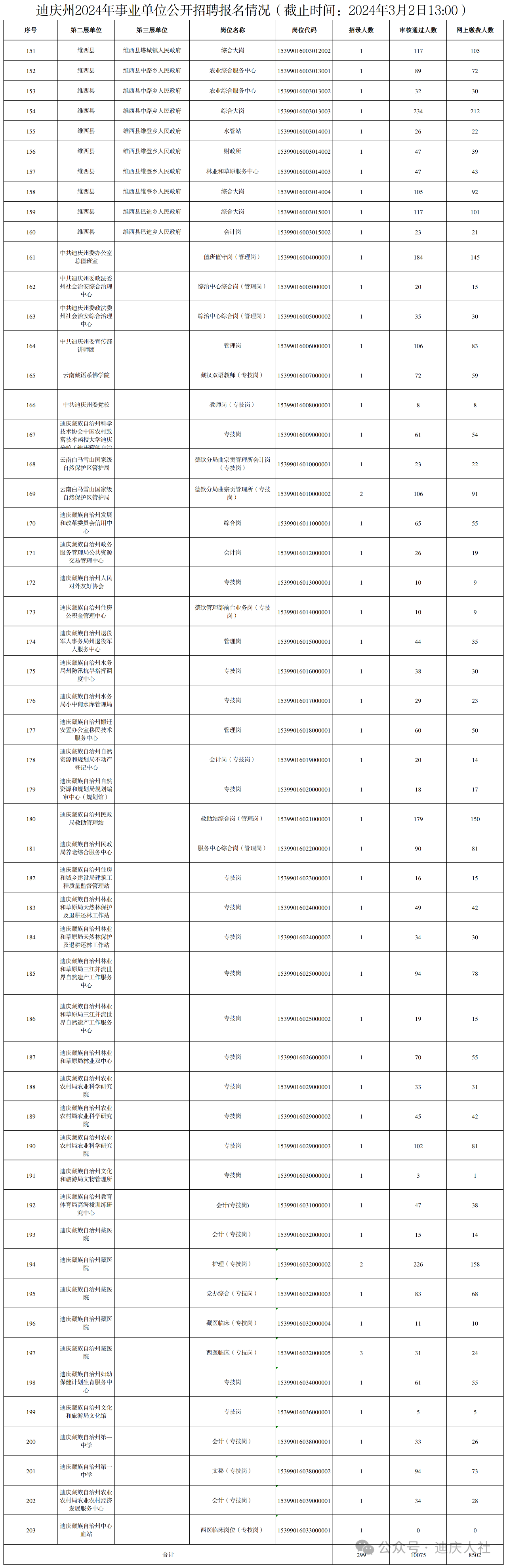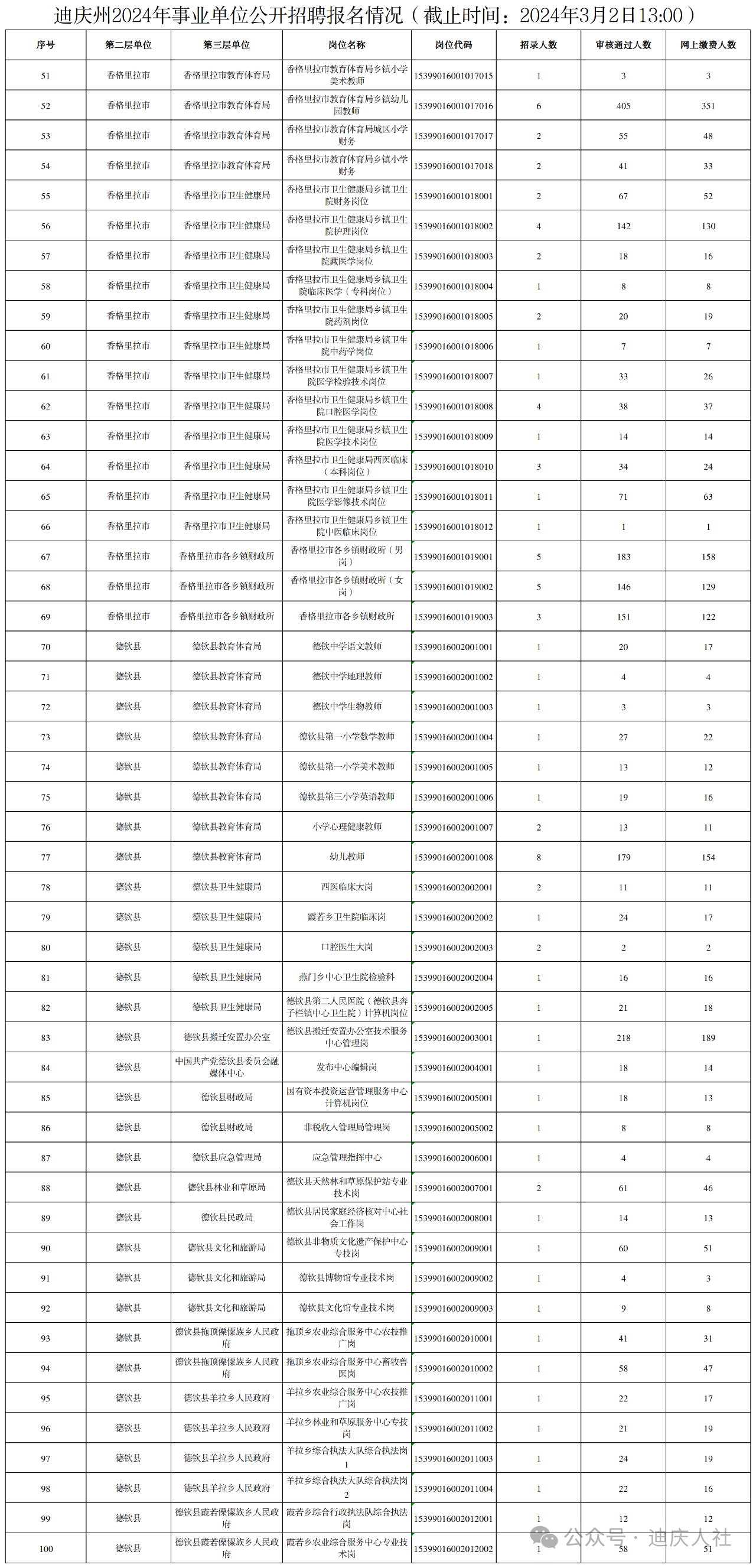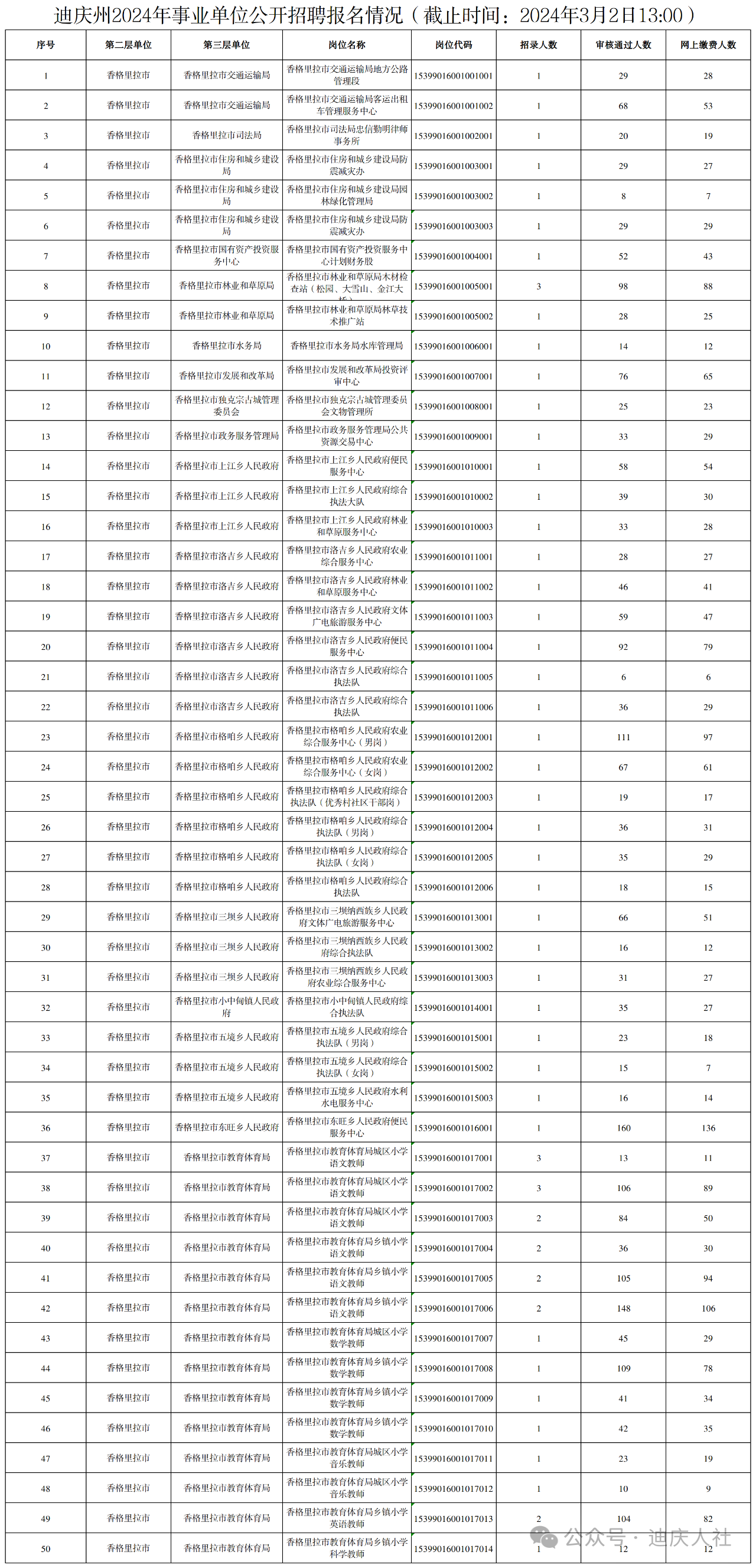 2024年迪慶州事業(yè)單位公開招聘工作人員崗位報(bào)名情況(截止3月2日13:00)