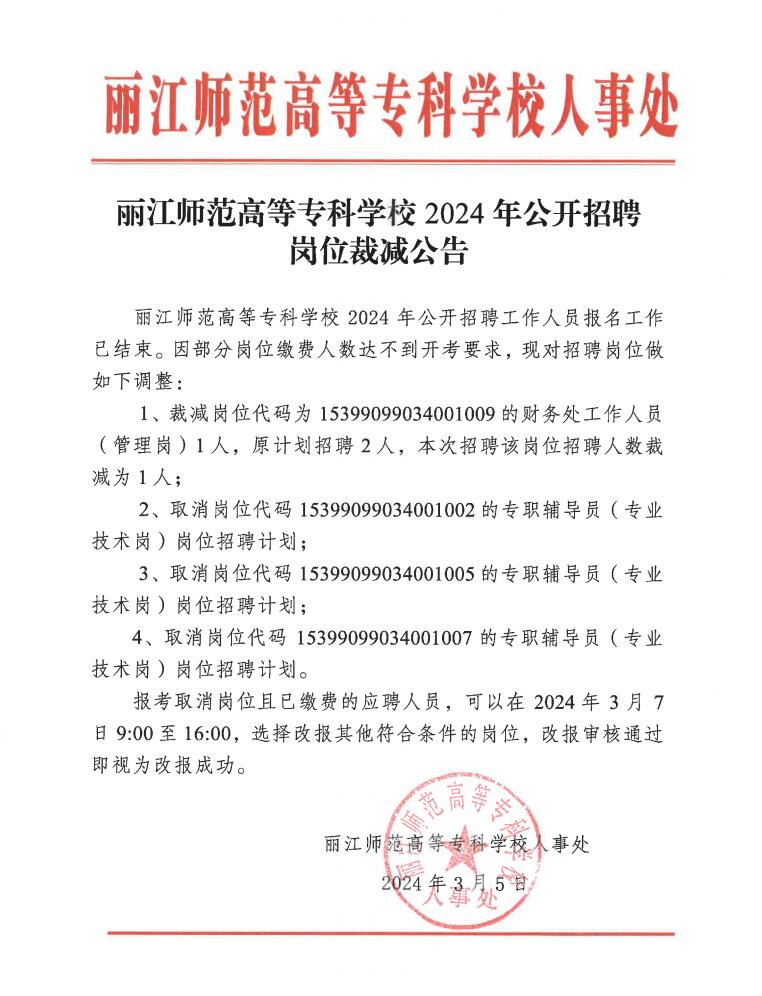 麗江師范高等專科學(xué)校2024年公開招聘崗位裁減公告