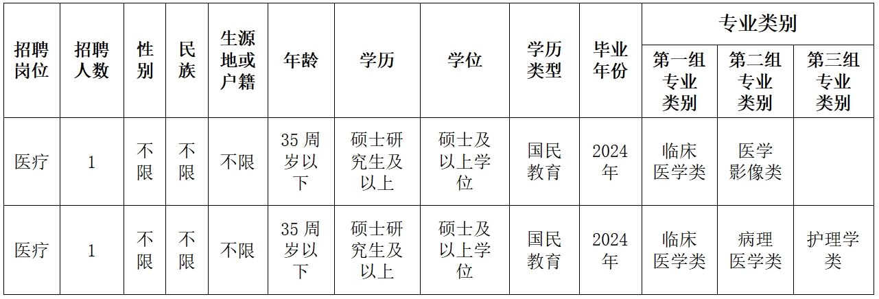 高等院校醫(yī)學(xué)類本科及以上學(xué)歷畢業(yè)后直接參加國(guó)家計(jì)劃內(nèi)住院醫(yī)師規(guī)范化培訓(xùn),2024年國(guó)家住院醫(yī)師規(guī)范化培訓(xùn)合格且具有國(guó)家執(zhí)業(yè)醫(yī)師資格,參加醫(yī)療衛(wèi)生行業(yè)招聘醫(yī)學(xué)類崗位的,視為2024年度應(yīng)屆畢業(yè)生(資格復(fù)審時(shí)須提供成績(jī)單、合格證明,否則取消聘用資格)。