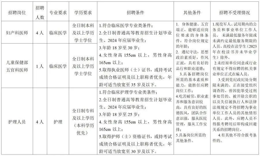 (2)應聘者須提供證件材料:本人有效身份證、個人簡歷(自薦表)、畢業(yè)證書(學位證書)、在校學習成績單、資格證書及執(zhí) 業(yè)證書、學校榮譽證書等相關證件原件及復印件一份;2024年應屆畢業(yè)生須攜帶《就業(yè)推薦表》原件和復印件一份,現(xiàn)場報名提交的相關證件原件,現(xiàn)場審查后退回本人 。