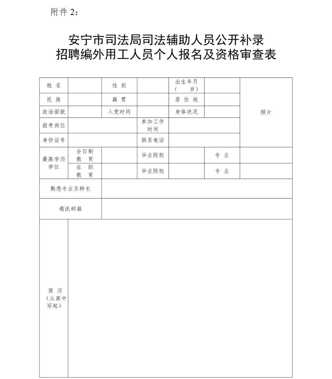 附件2:安寧市司法局司法輔助人員公開補錄招聘編外用工人員個人報名及資格審查表。