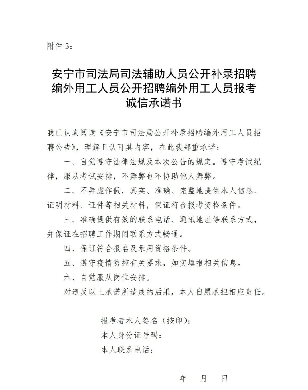 附件3:安寧市司法局司法輔助人員公開補錄招聘編外用工人員公開招聘編外用工人員報考誠信承諾書。