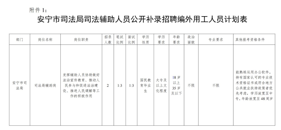 附件1:安寧市司法局司法輔助人員公開補錄招聘編外用工人員計劃表。