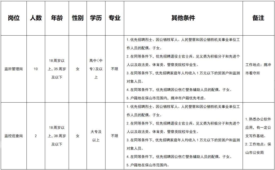 (1)監(jiān)所管理崗:騰沖市公安局政治處618辦公室,聯系人及聯系電話:尹警官 13887825018。