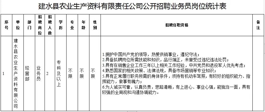 具體招聘崗位、崗位資格條件等要求詳見附件《建水縣農(nóng)業(yè)生產(chǎn)資料有限責(zé)任公司公開招聘業(yè)務(wù)員崗位統(tǒng)計表》。