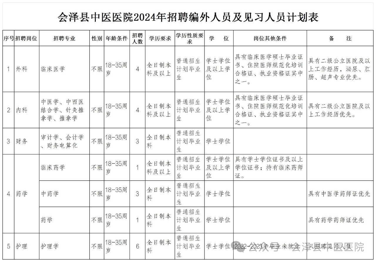 招聘計劃和資格條件要求詳見《會澤縣中醫(yī)院2024年公開招聘編外人員及見習人員計劃表》(附件1)